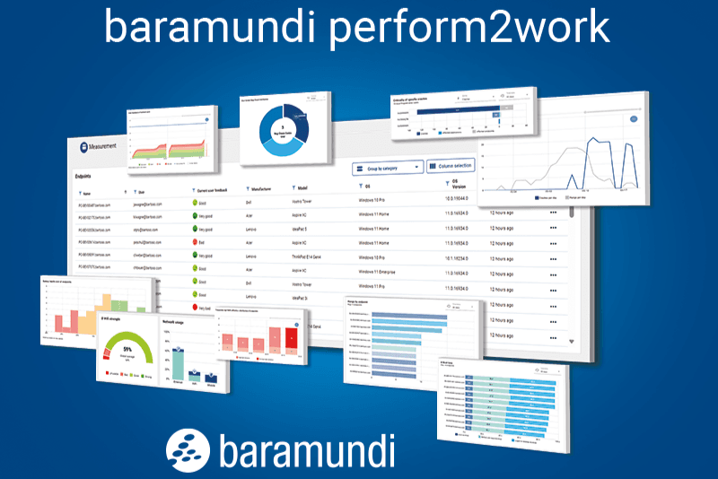 In addition to our Management Suite, the baramundi Proactive Hub with its baramundi perform2work offers straightforward end device monitoring and an innovative digital employee experience approach: end user feedback and performance indicators are recorded and current and historical data is visualized via a web interface with comprehensive data protection and rights management. This increases the efficiency of IT administration as well as end-user satisfaction.